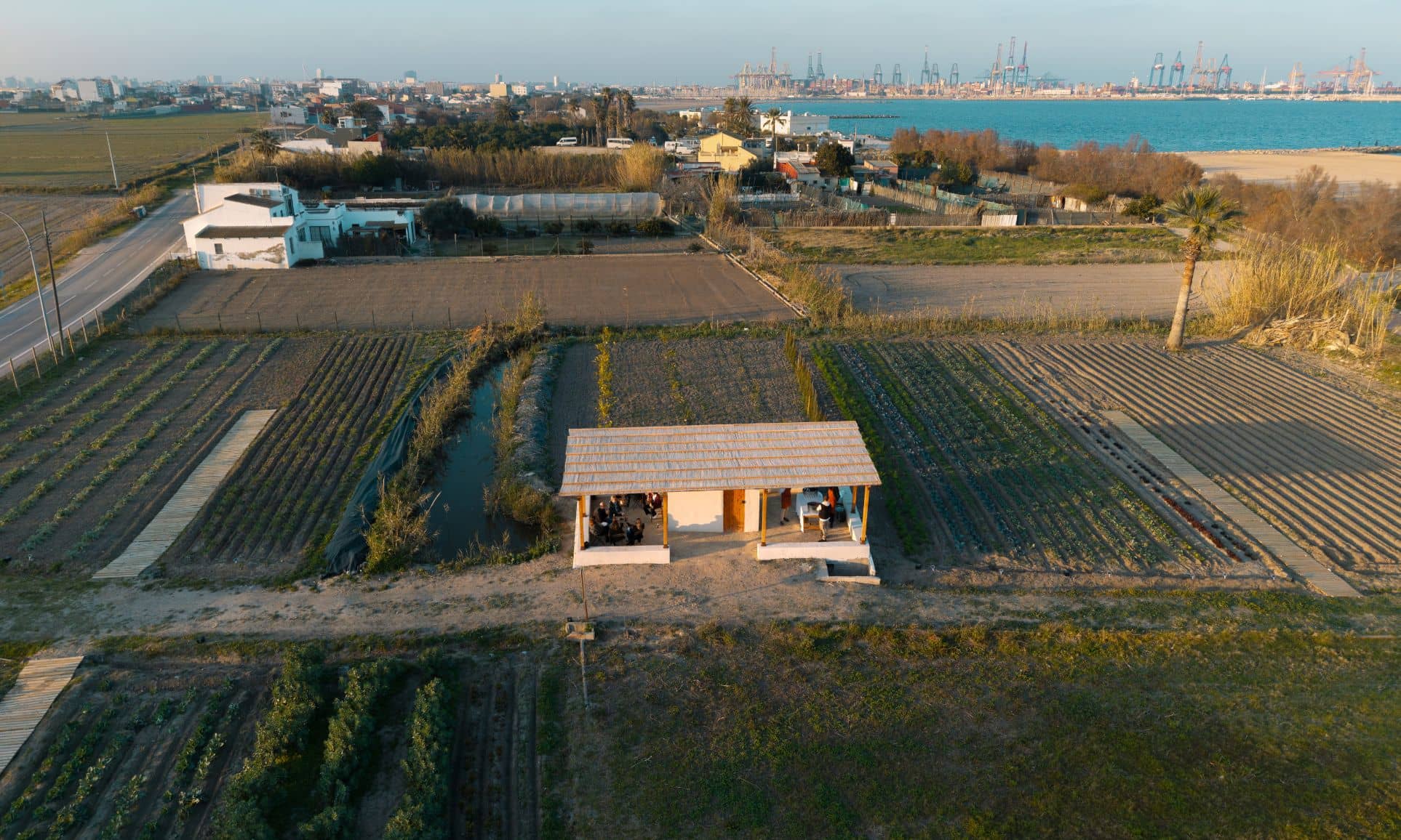 Maravella se concibe como una alquería contemporánea camino a la Albufera. El proyecto arquitectónico, firmado por el estudio Janfri & Ranchal, integra materiales naturales, agua, vegetación y luz para dialogar con el entorno de Pinedo y mantener una conexión constante con el territorio.