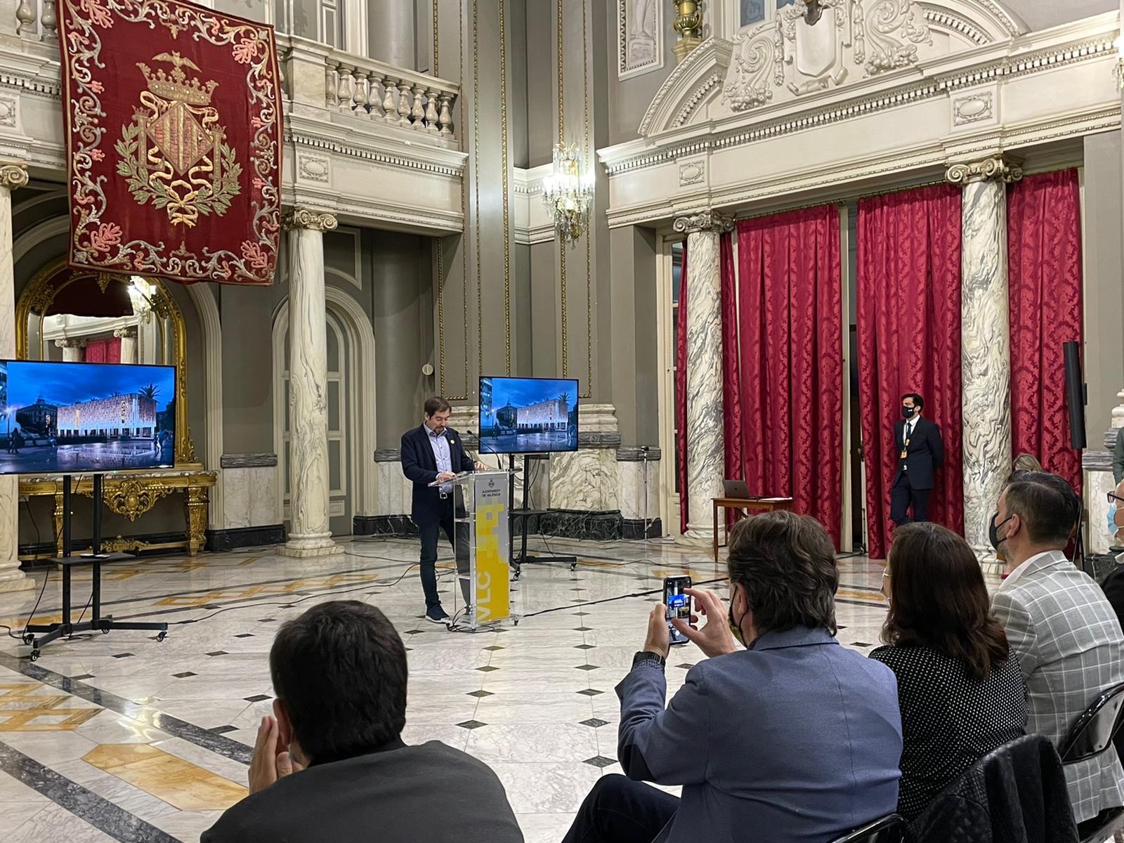 El Saló de Cristall ha acollit este matí la presentació d’Àgora València, “un lloc de trobada al cor de la ciutat que ens permetrà unir disseny, creativitat i talent amb indústria, artesania i tecnologia”, en paraules de l’alcalde, Joan Ribó. En dos mesos es podrà gaudir d’este espai arquitectònic, que “reflectix a la perfecció els valors del poble valencià: creativitat, talent, generositat, obertura, diversitat”. L’alcalde ha subratllat així mateix que “València s’ha convertit en Capital Mundial del Disseny gràcies a la seua relació directa amb l’artesania, amb la indústria del moble, les arts gràfiques, la ceràmica, la indústria de la joguina, el calçat o el tèxtil”.