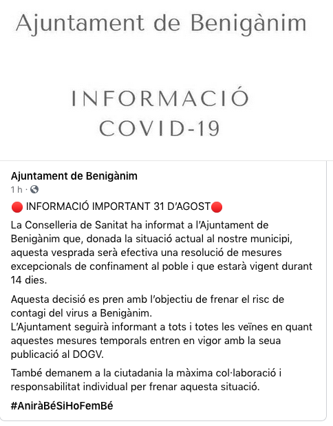 La localidad de Benigànim, en la Vall d’Albaida, inicia la tarde de este lunes, día 31 de agosto, un confinamiento decretado por Sanidad como consecuencia de la situación de crisis sanitaria ocasionada por la Covid19 que vive en la actualidad la localidad. Así lo informaba la conselleria de Sanidad Universal y Salud Pública mediante una nota de prensa, previa comunicación a su alcaldesa, Amparo Canals, vía teléfonica, tal y como relata a Valenciacity.es el vicealcalde de Benigànim, Cristobal Barceló, el cual, por cierto, fue uno de los infectados en el primer brote y permanece aislado en casa desde entonces.