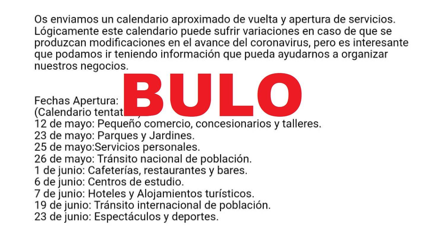 Se está viralizando una cadena de WhatsApp con las supuestas fechas de apertura de comercios y otros servicios. Un calendarío que empezaría el 12 de mayo con el “pequeño comercio” y acabaría el 23 de junio con los “espectáculos y deportes”. Estas fechas salen de un gráfico que ya hemos desmentido y que es la opinión de 400 encuestados por una empresa del sector de la automoción, no unas fechas oficiales ni publicadas por el Gobierno. Os lo explicamos.