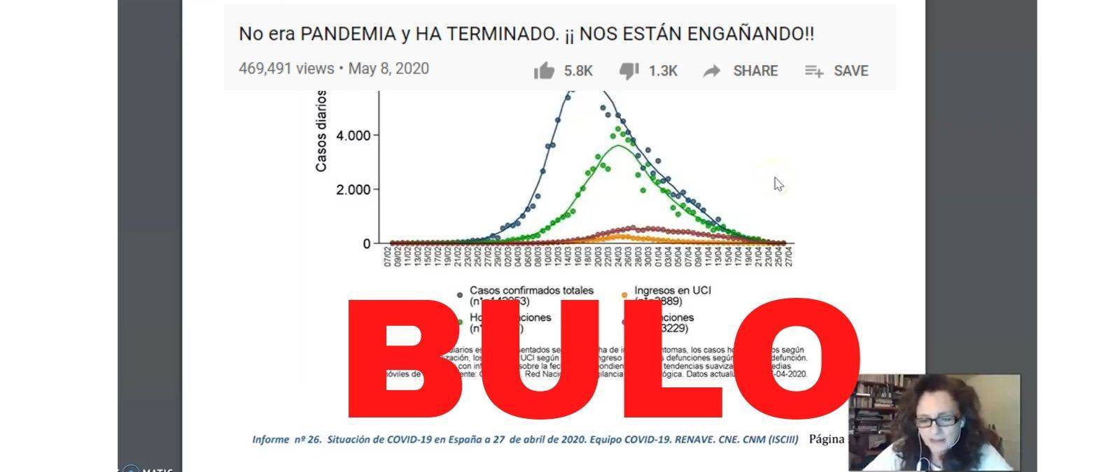 Nos habéis preguntado por un vídeo (ya retirado de Youtube) en el que una mujer llamada Pilar Baselga asegura que el Instituto de Salud Carlos III de Madrid ha dicho en un informe que la pandemia por coronavirus SARS-CoV‑2 ha terminado. Para decir esto se basa en una gráfica de curvas publicada en el informe número 26 de dicho organismo: “La pandemia ha terminado y no lo digo yo, lo dice el Instituto Carlos III con su departamento de Epidemiología, aquí estoy en su página web oficial, y esta es la curva del COVID-19” [a partir del minuto 00:12]. Es un bulo.