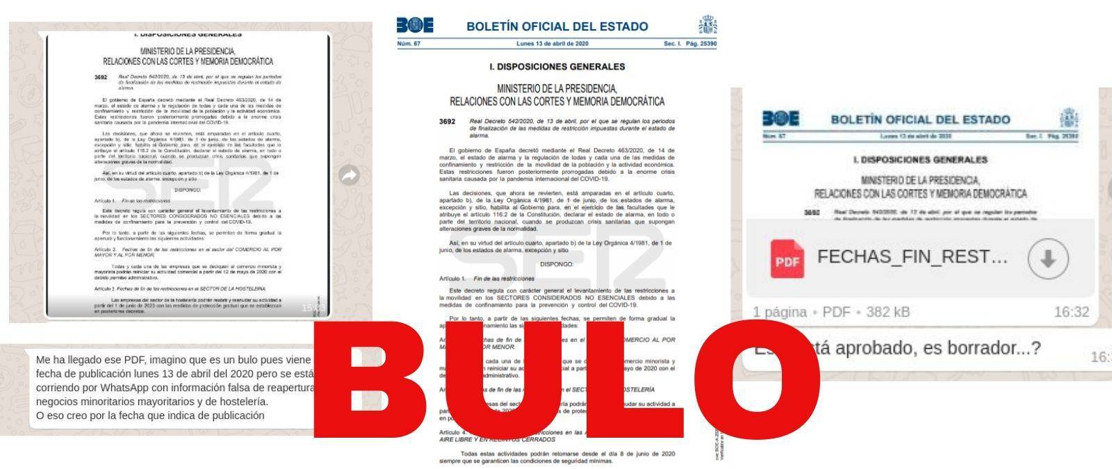 Nos habéis preguntado por un supuesto documento del Boletín Oficial del Estado (BOE) con fecha de 13 de abril “por el que se regulan los periodos de finalización de las medidas de restricción impuestas durante el estado de alarma” por el coronavirus y que tiene la marca de agua de la Cadena SER. Es un bulo: este documento no ha sido publicado en el BOE, los elementos del documento no coinciden con los oficiales y son idénticos a los de otro real decreto y la propia Cadena SER lo ha desmentido. Es decir, se trata de un montaje. Además, desde el Gobierno han indicado en Twitter que se trata de un documento falso.*