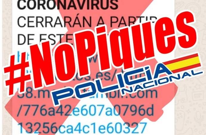 La Policía Nacional ha advertido por las redes sociales de la falsedad del mensaje que está circulando en el que se asegura que todos los supermercados cerrarán a partir del miércoles. La información, que aparece supuestamente vinculada al medio 20minituos, es totalmente falsa según asegura la policía, que ha hecho un llamamiento a la población para que contraste este tipo de informaciones y que consulte siempre fuentes oficiales antes de darle credibilidad, además de abstenerse de compartirlas.