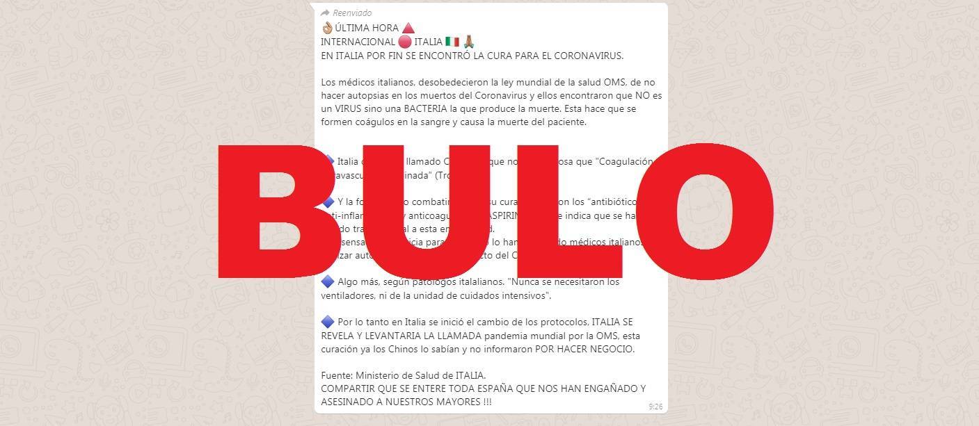 En los últimos días nos habéis enviado muchísimo una cadena que circula por WhatsApp que dice que en Italia ya se ha encontrado la cura para el coronavirus, gracias a que los médicos italianos desobedecieron “la ley mundial de la salud OMS” de no realizar autopsias a los fallecidos por coronavirus. Esta sería la manera en la que habrían hallado que la causa de la COVID-19 “no es un virus” sino “una bacteria que produce la muerte” haciendo que “se formen coágulos en la sangre”. Esto es un bulo. Te contamos lo que sabemos al respecto: