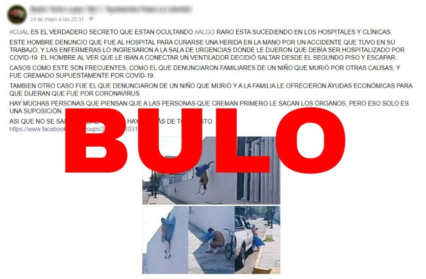 Están circulando en redes sociales unas imágenes de un hombre vestido con la bata de un hospital y que parece huir saltando un muro del edificio. Según el contenido, este hombre denunció que había acudido al centro sanitario a que le curasen una herida en la mano cuando le aseguraron que debía ingresar por COVID-19 y que cuando “le iban a conectar un ventilador decidió saltar desde el segundo piso y escapar”. Es un bulo. Las imágenes son de noviembre de 2019, cuando todavía no se había descubierto el nuevo coronavirus y el hombre es en realidad un presunto reo que intenta escapar de un hospital de Ciudad de México.
