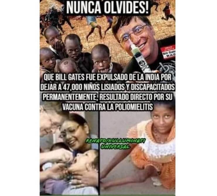 Desde que comenzase el brote de coronavirus y la actual pandemia de COVID-19 han circulado ya varias acusaciones que relacionan al cofundador de Microsoft, Bill Gates, y a su esposa, Melinda Gates, con la aparición del virus o con teorías conspiratorias sobre las vacunas. En esta ocasión, un meme asegura que Bill Gates fue “expulsado de la India por dejar a 47.000 niños lisiados y discapacitados permanentemente, resultado directo por su vacuna contra la poliomielitis”. Sin embargo, como ya contamos aquí, su Fundación no ha sido expulsada del país, de la que la Fundación es uno de sus socios principales. Además, las acusaciones sobre las vacunas son falsas. Os lo contamos.