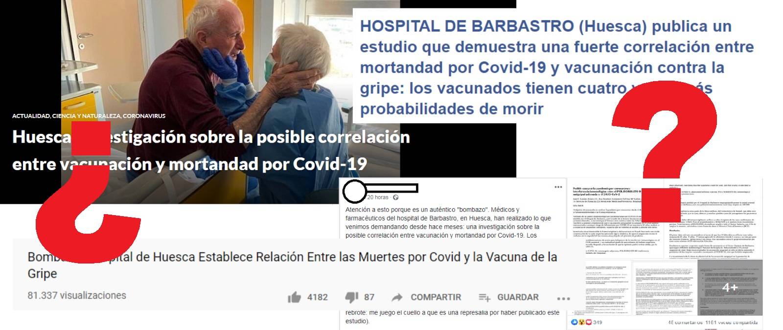 Esta reco­gi­da de datos fue rea­li­za­da por tres médi­cos del hos­pi­tal de Bar­bas­tro, en Hues­ca. En ella se ana­li­zan los 45 falle­ci­mien­tos por COVID-19 que ha habi­do en ese área hos­pi­ta­la­ria y en una resi­den­cia de ancia­nos de la mis­ma zona. De los 20 falle­ci­dos en el hos­pi­tal, 17 habían sido vacu­na­dos con­tra la gri­pe; y de los 25 que murie­ron en la resi­den­cia, 24 habían reci­bi­do la mis­ma vacu­na. Los resul­ta­dos resul­ta­ron lla­ma­ti­vos para los auto­res por­que el por­cen­ta­je de vacu­na­dos entre las víc­ti­mas es mayor que el por­cen­ta­je de vacu­na­dos entre la pobla­ción gene­ral.