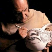 Comienza produciendo objetos de barro utilitarios como botijos y orzas que decora con trazos incisos sobre la superficie del barro tierno. Con el paso del tiempo y de la experiencia, esta técnica de esgrafiado o ‘raspado’, se convertirá en una de las características de la cerámica de Cuenca.