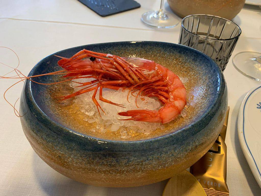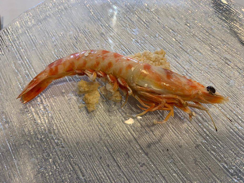 Empezamos con discusiones en torno al vino. La apuesta fue por un rosado, el vino que supuestamente iba mejor por su neutralidad y suave potencia a un arroz de postín. Pedimos un By.Ott provenzal que no llegó ni al primer aperitivo, un pastel de foie con boniato. Luego hubo una demostración de productos premium: una gamba rayada hervida de gran calibre, un suculento langostino de Vinaròs… mariscos ante cuya llegada ya habíamos cambiado a un Riesling jovencito del Mosela, muy frío, como debe ser.