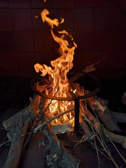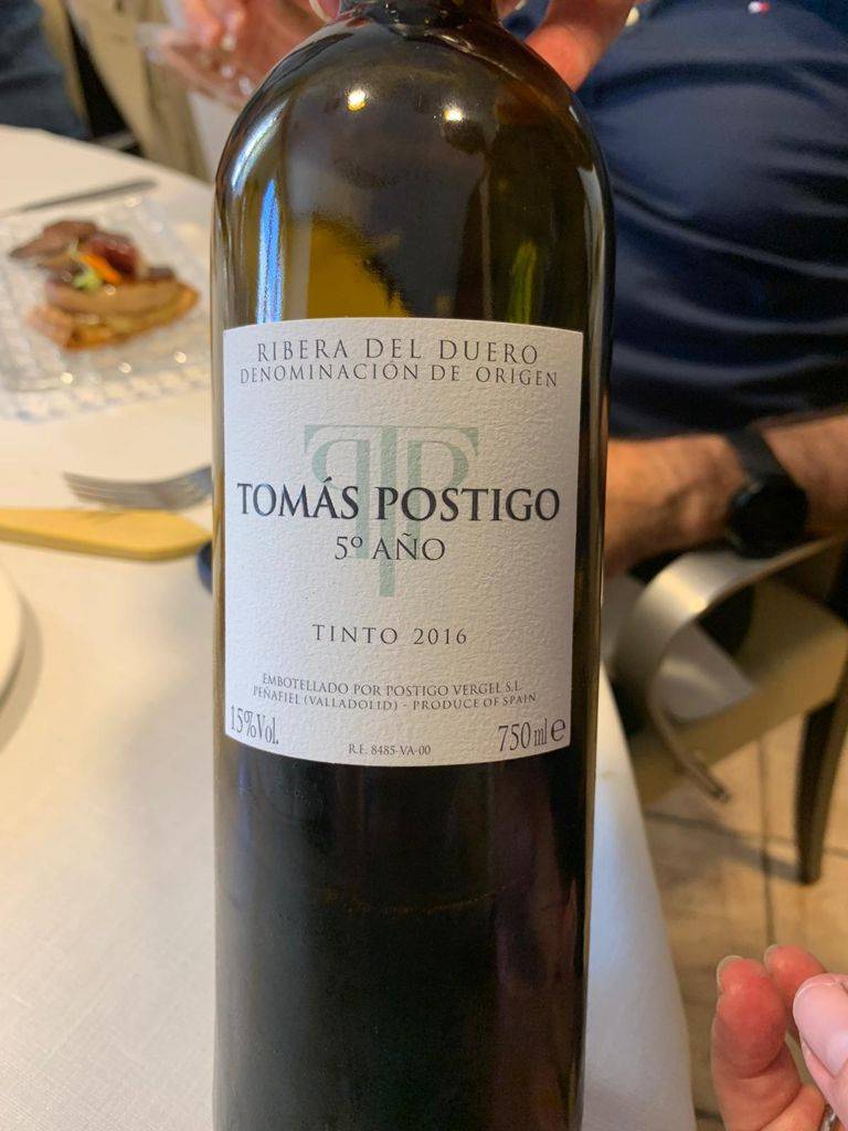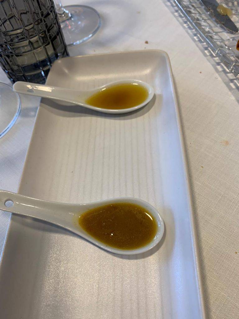 A estas alturas ya estábamos con un tinto poderoso, un Tomás Postigo, Ribera de quinto año, cuando el mismo Vicente se sienta en nuestra mesa para que probemos dos bocados pre-paella: una cucharada del caldo de la paella y un hígado de conejo bien fritito…