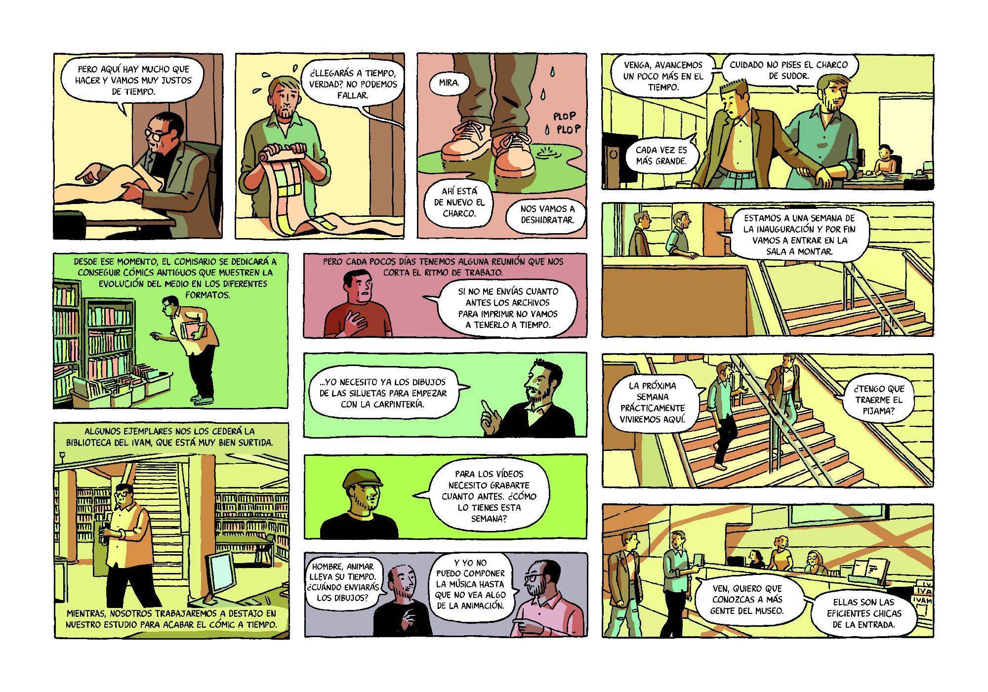 El cómic des­gra­na cómo sur­gió el pro­yec­to de la expo­si­ción, las reunio­nes de Paco Roca con el direc­tor José Miguel G. Cor­tés y el comi­sa­rio Álva­ro Pons, expli­ca­cio­nes sobre las fun­cio­nes de los dis­tin­tos depar­ta­men­tos del museo o anéc­do­tas de los visi­tan­tes, en un home­na­je del ilus­tra­dor valen­ciano por el 30º ani­ver­sa­rio del IVAM. Las viñe­tas tam­bién recrean espa­cios sin­gu­la­res del museo, como las cáma­ras que cus­to­dian las obras de arte o los alma­ce­nes de trán­si­to de las pie­zas.