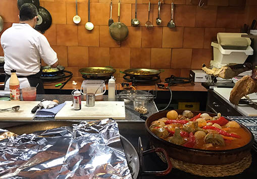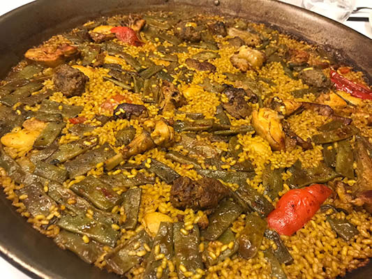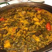 Es una paella de pollo y conejo bien troceados y sofritos, con sus mollejas e hígados para dar más profundidad de sabor. Y se le añaden pelotas de magro (pilotes de magre amb julivert, pinyons i un lleuger toc de canella… deliciosas), que los comensales, y en especial los niños, acaban persiguiendo por el caldero. Lleva también el imprescindible garrofón, judías verdes en abundancia (quizás excesiva) y alguna que otra alcachofa. Ni romero, ni caracoles, ni tabella ni rotjet.