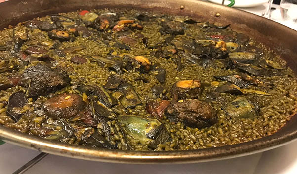 Junto a la paella “valenciana con pilotes” Esther nos presenta la paella de invierno, casi negra. Lleva las carnes y verduras habituales además de una buena cantidad de alcachofas que se han dejado oxidar –nada de limón ni perejil para blanquearlas– y unos pocos robellones. Dentro de unas semanas también le añadirán habas. Su color es verde oscuro intenso. El mismo arroz que comíamos en Xàtiva cuando llegaba el frío y la huerta local se inundaba de alcachofas, pencas y habas.