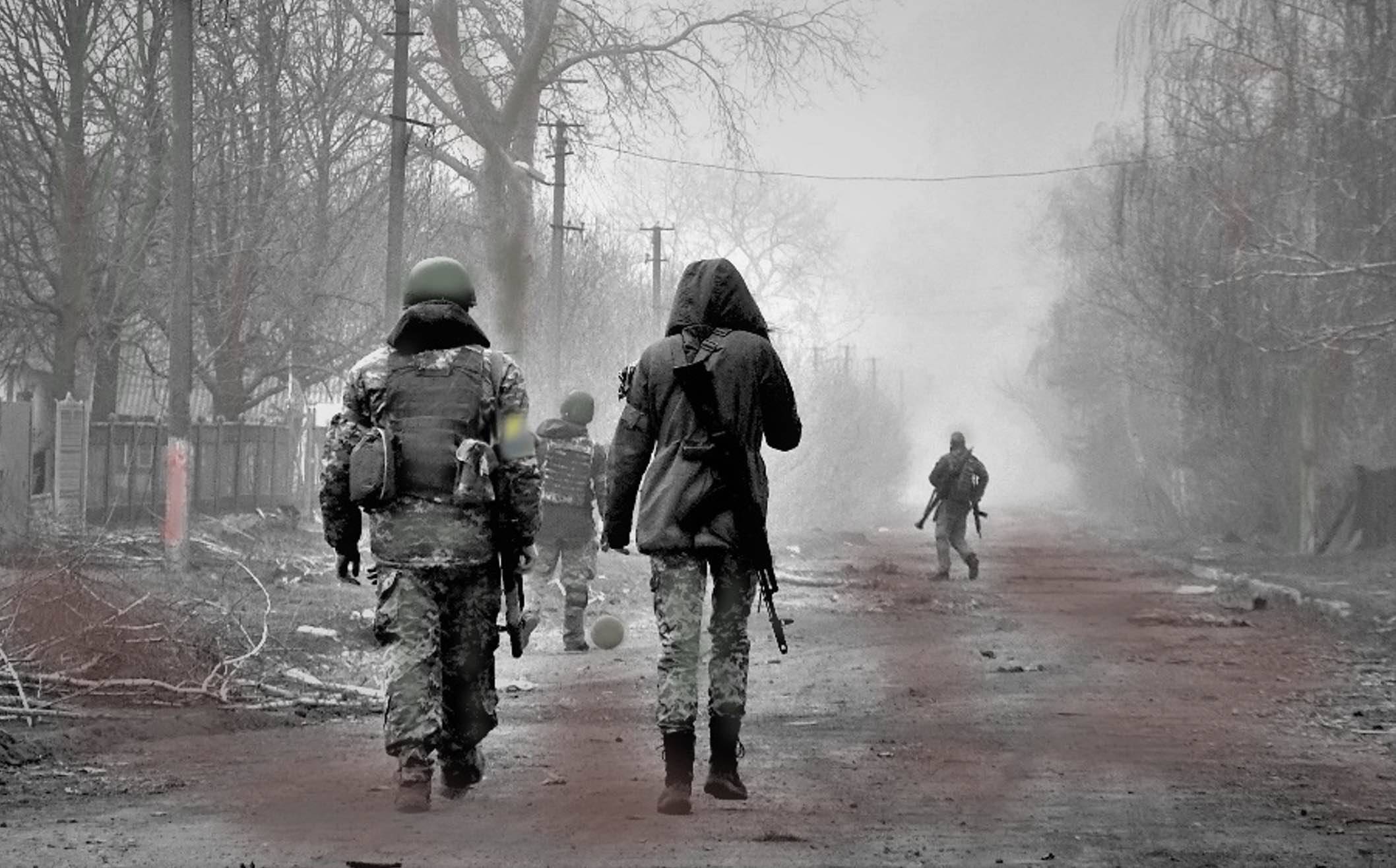 Un gru­po de sol­da­dos ucra­nia­nos en la ciu­dad de Irpin (FERNANDO DARDER).