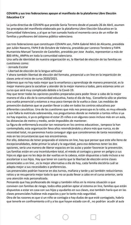 Copava se suma así al manifiesto lanzado por la plataforma por la Libre Elección Educativa en la Comunidad Valenciana que reproducimos a continuación.