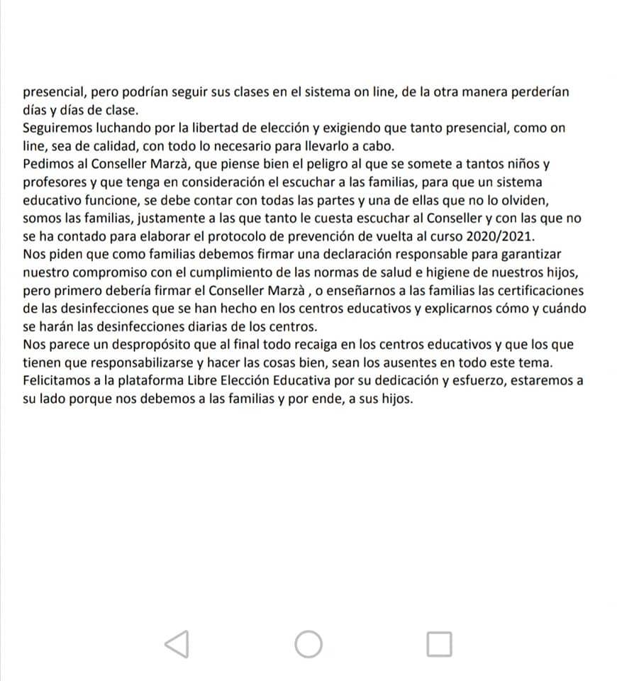 Por tanto, consideran que la opción de que cada famlia pueda elegir entre la modalidad online o presencial “es la mejor alternativa a día de hoy.”