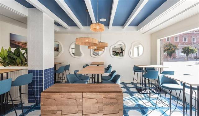 La primera zona es de estética más informal y fresca donde la luz se refleja en los tonos predominantes azules y blancos y se integra junto a elementos cerámicos que asemejan formas marinas. En la segunda zona, con una decoración más sofisticada, se fusionan detalles de decoración como las lámparas cerámicas y elementos naturales, que, unidos a formas orgánicas recreadas en las bancadas, actúan como elemento de separación entre espacios. El establecimiento cuenta también con dos amplias terrazas exteriores.