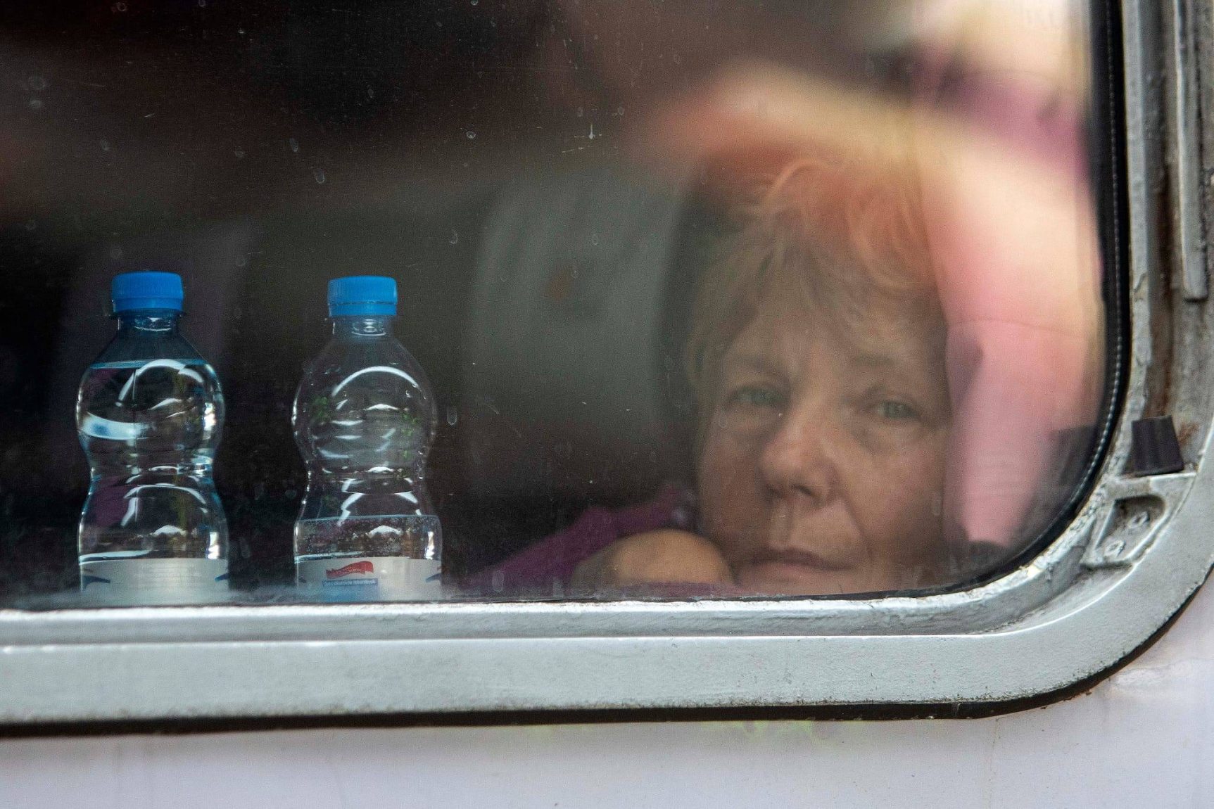 Una mujer ucraniana mira al horizonte desde un vagón de tren. Fotografía: Benito Pajares.