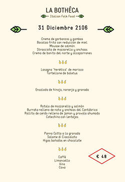 La Bothé­ca es  un lugar lleno de sabor y tra­di­ción y para mos­trar sus deli­cias ita­lia­nas, ofre­cen un menú a la altu­ra de la últi­ma cena del año. Detrás de este pro­yec­to gas­tro­nó­mi­co con sabor cine­ma­to­grá­fi­co ita­liano están los cineas­tas Mas­si­mo Nata­le, direc­tor de cine y pro­duc­tor, Gian­pie­ro Fon­ta­na, pro­duc­tor de tea­tro, y la actri­ces Daría Bot­te y Sil­via Del­fino, que cam­bia­ron las pelí­cu­las por la coci­na para traer la autén­ti­ca moz­za­re­lla a Valen­cia.