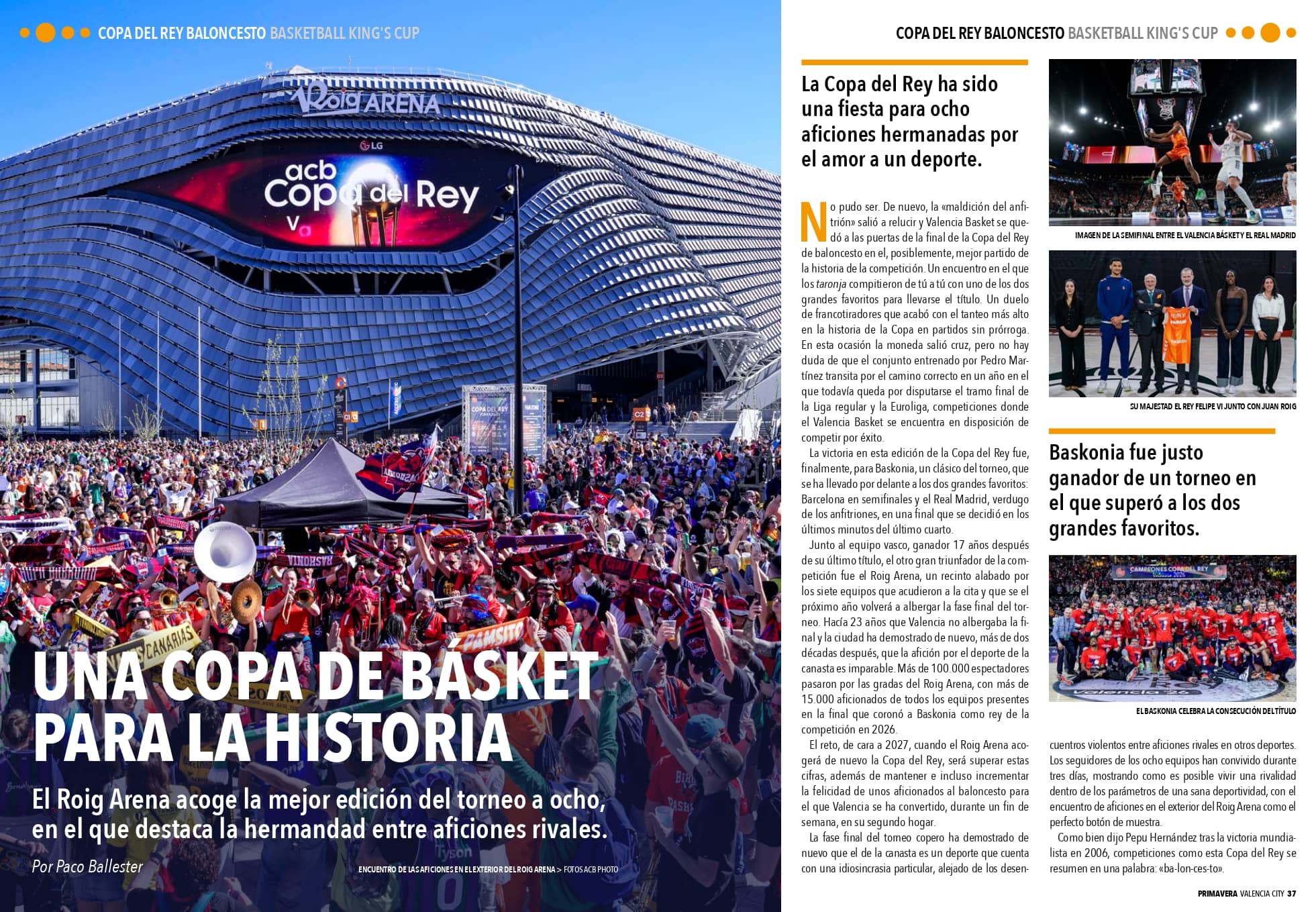 La revista contiene un especial sobre la fase final de la Copa del Rey de Baloncesto, celebrada en el Roig Arena a finales del mes de febrero, un torneo que convirtió el recinto valenciano en la casa para las ocho aficiones de los equipos finalistas. El especial incluye también un amplio artículo sobre la evolución del baloncesto en la ciudad, a cargo del escritor y peñista del Valencia basket, Miguel Roselló y un artículo sobre la relación entre cine y baloncesto, escrito por Paco Ballester. El especial se cierra con un emotivo recuerdo a uno de los jugadores míticos de la entidad, el recientemente fallecido Brad Branson.