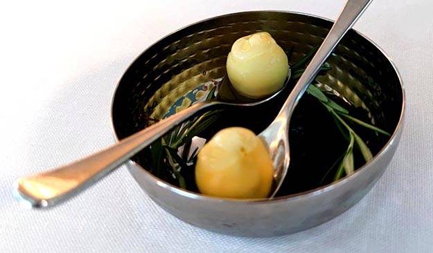 En todos los restaurantes siempre hay un punto estratégico desde el que se puede apreciar el ballet de la cocina, la coreografía de la sala y la melodía de la bebida. Ahí es donde esperamos sentarnos expectantes y mirar a la puerta de la cocina esperando la salida firme y acompasada del servicio de sala profesional, serio y cercano, que esta temporada y en algunos platos, tenemos el gusto que sea de la propia mano de Rafa quién lo disponga en mantel y cante in voce lo que viene a continuación, como se dispone y de qué modo y orden se debe llevar al paladar.