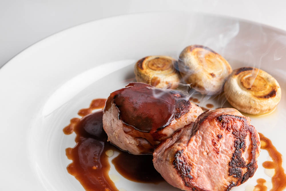 El plato principal son unos medallones de solomillo ibérico con champiñones asados y salsa de Touriga de Oporto. Sanchís se recrea en un clásico de la cocina tradicional, sacando la carne tan sólo marcada, con el toque especial que brinda el vino dulce de Oporto, y lo acompaña únicamente de guarnición de las setas. Cocina muy honesta, incluso minimalista.