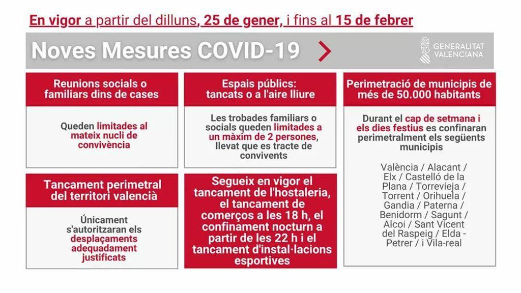 Las nue­vas medi­das entra­rán en vigor a par­tir de este lunes, día 25 de enero, cuan­do se publi­que en el Dia­ri Ofi­cial de la Gene­ra­li­tat y per­ma­ne­ce­rán en prin­ci­pio has­ta el 15 de febre­ro.