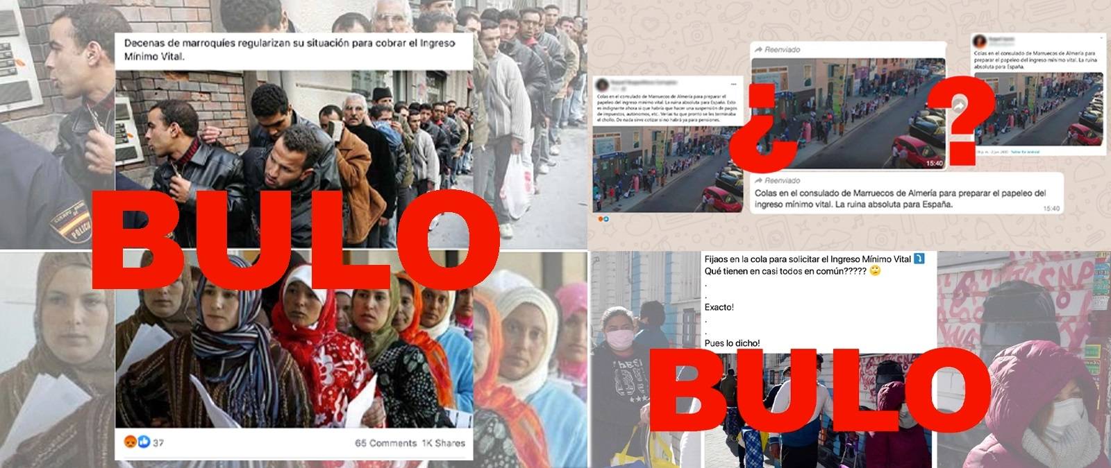Con la aprobación y publicación del Ingreso Mínimo Vital (IMV), los desinformadores han sacado sus armas contra esta ayuda para difundir bulos que la relacionen con las personas inmigrantes. Que tienen ventajas o que van a copar todas estas ayudas son algunos de las afirmaciones que han circulado en el último mes. Para apoyar estos mensajes, muchos de los bulos han rescatado fotos de personas inmigrantes haciendo cola y los difunden con mensajes como “Decenas de marroquíes regularizan su situación para cobrar el Ingreso Mínimo Vital” o “colas para preparar el papeleo para el Ingreso Mínimo Vital. La ruina absoluta para España”. Sin embargo, estas fotos o no son actuales o que nada tienen que ver con esta prestación, sino con colas en bancos de alimentos.