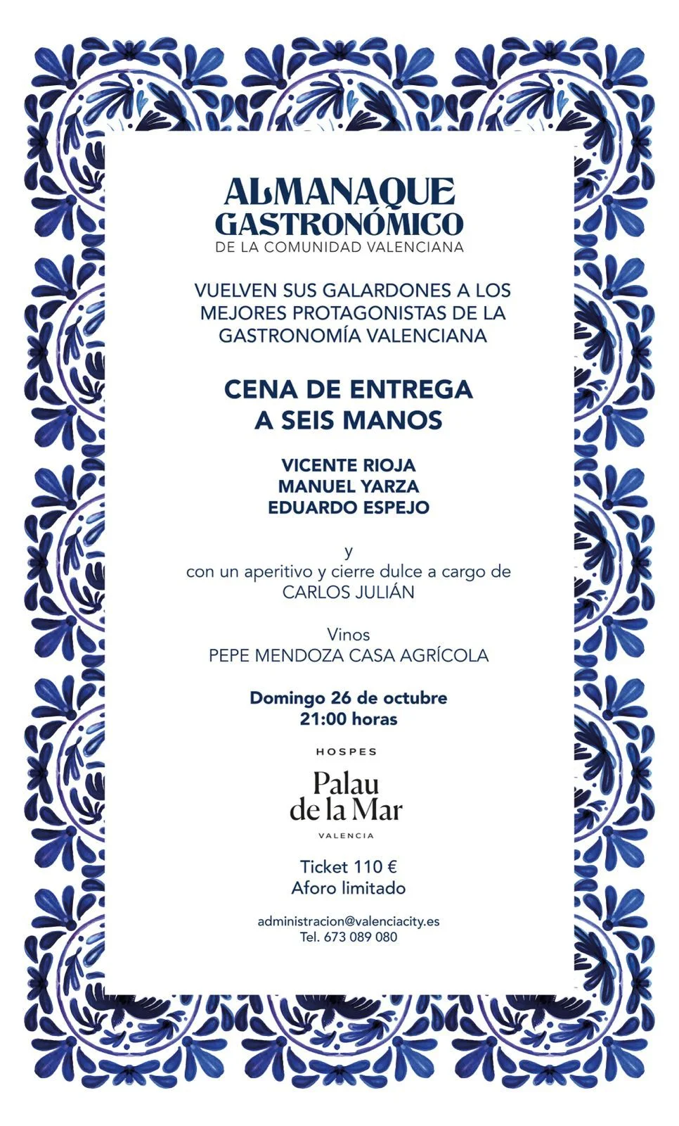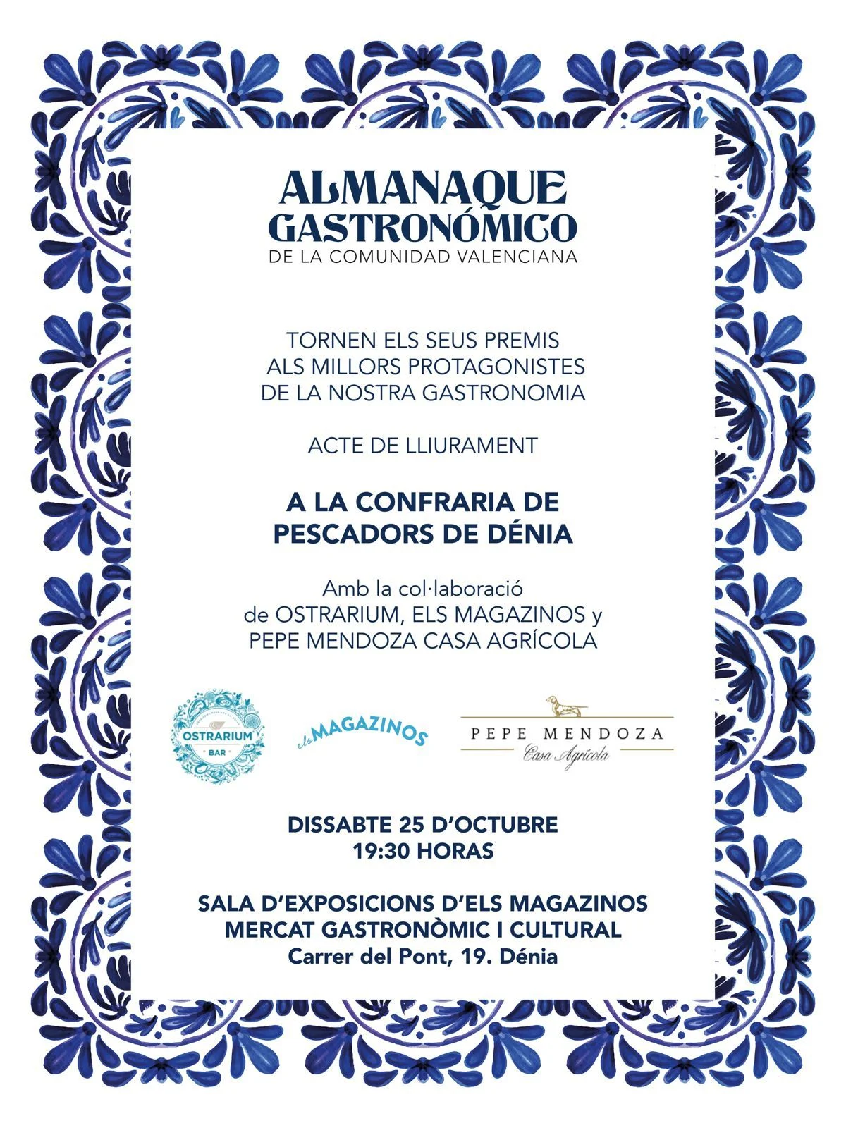 La celebración tendrá lugar en dos fases: la primera el sábado 25 de octubre en Els Magazinos con la entrega a los representantes de La Marina. Y la segunda, el domingo 26 de octubre, con una cena a seis manos a cargo del resto de premiados con aforo limitado.