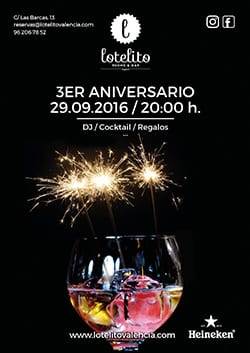 El pró­xi­mo jue­ves 29 de sep­tiem­bre el res­tau­ran­te Lote­li­to cele­bra su ter­cer ani­ver­sa­rio. La cita ten­drá lugar en el local a las 20:00 horas. En él se podrá dis­fru­tar de algu­nos de los pla­tos de su nue­va car­ta que pre­sen­ta­rán den­tro de muy poco. Tam­bién habrá un DJ que ame­ni­za­rá la tar­de, sor­teos y pho­to­call.
