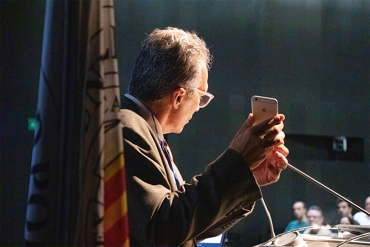 Álvaro Pascual-Leone muestra su Smartphone durante su conferencia. Foto cortesía de SmartBusiness
