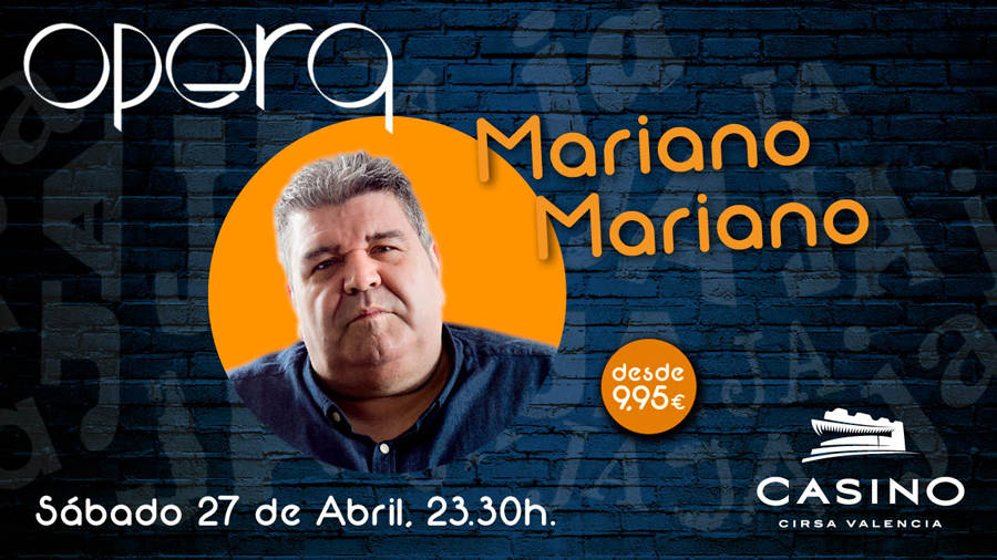 El tele­vi­si­vo Mariano Mariano, cómi­co que se hizo muy popu­lar en la tele­vi­sión de los años 90, será el encar­ga­do de cerrar el car­tel de monó­lo­gos del mes de abril de la sala Ópe­ra de Casino Cir­sa Valen­cia y que ha con­ta­do con un elen­co de ver­da­de­ro lujo con estre­llas como Car­men Alcay­de o Raúl Antón y entra­das ago­ta­das en todos los pases.