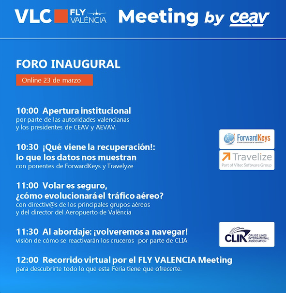 El 23 de marzo tendrá lugar la inauguración con una jornada emitida por streaming, desde la Marina de Valencia, en la que participarán autoridades valencianas y los presidentes de CEAV y AEVAV. Asimismo, la jornada incluirá tres charlas de apertura que pondrán el foco en los datos turísticos que apuntan a una pronta recuperación y en el restablecimiento del tráfico aéreo y de cruceros.