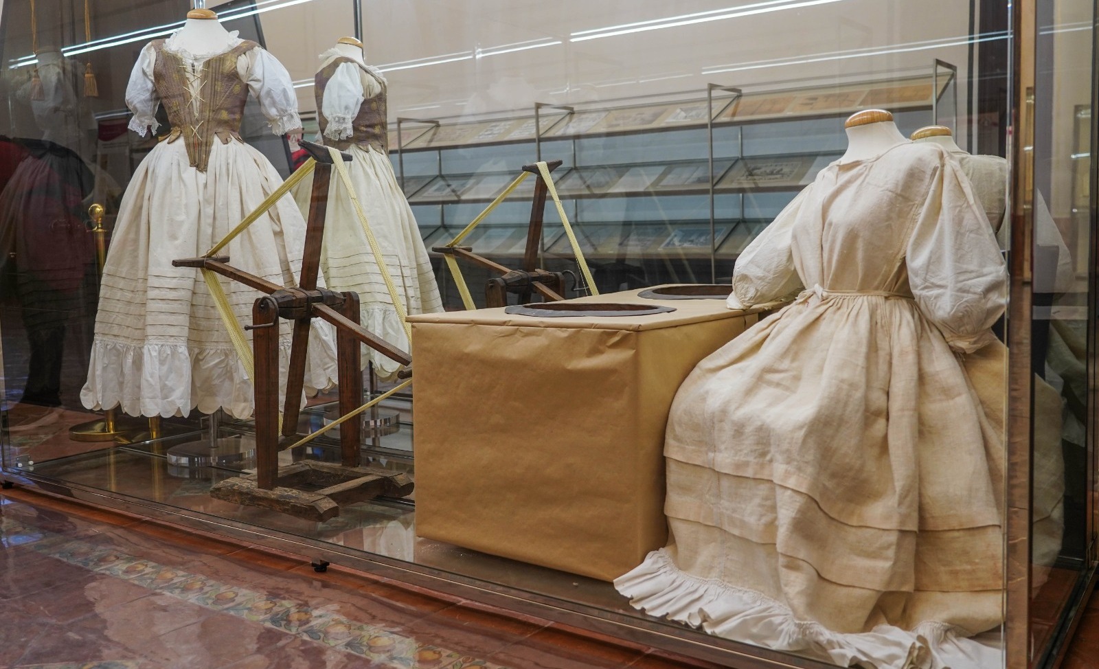“La participación valenciana en la Ruta de la Seda” plantea un recorrido a través de los siglos y de las salas del Museo de la Seda, albergando la primera parte en la sala de la Capilla, donde se pueden conocer los orígenes de la sedería valenciana. Sigue, en la sala de la Pometa, con los procesos de la producción de la seda: sericicultura, hilatura, tintado y, finalmente, tejido, las cuatro fases fundamentales de producción de la seda. El visitante podrá ver “una recreación de una escena de cómo era el trabajo del labrador de la Huerta y su familia, con relación al cultivo de la morera y crianza del gusano de seda. Además, también se representa a una hilandera asistida por la menadora en una de las vitrinas, y en la otra al matrimonio de labradores vestidos en traje de festivo”, afirma otro de los comisarios, Vicent Ferrandis Mas, miembro del Comité Científico del Museo de la Seda, investigador y coleccionista de indumentaria tradicional, además de artífice de estas recreaciones.