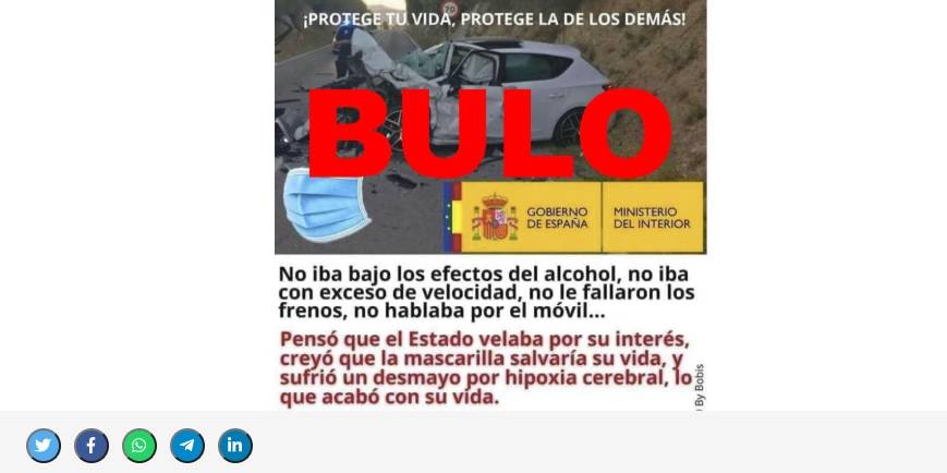 Cir­cu­la por redes una ima­gen de un acci­den­te de trá­fi­co cuyo con­duc­tor murió supues­ta­men­te al sufrir una hipo­xia por lle­var pues­ta la mas­ca­ri­lla. Sin embar­go, se tra­ta de un bulo pues­to que la foto corres­pon­de a un acci­den­te de trá­fi­co ocu­rri­do en Mallor­ca el 1 de junio de 2019, meses antes de la pan­de­mia de la COVID-19 y de que el Gobierno reco­men­da­ra el uso de las mas­ca­ri­llas.