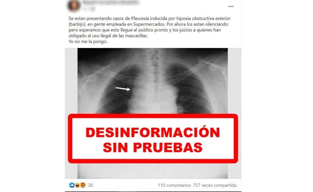 Circula un contenido en redes sociales que asegura que “se están presentando casos de pleuresía inducida por hipoxia” debido al uso de la mascarilla en empleados de supermercados. “Por ahora los están silenciando pero esperamos que esto llegue al público pronto y los juicios a quienes han obligado al uso ilegal de las mascarillas. Yo no me la pongo”, añade el contenido. Al texto lo acompaña la radiografía de un tórax en el que se pueden ver los pulmones de una persona. Pero no hay pruebas de que se estén dando estos casos. Además, la imagen que usa no tiene nada que ver con el coronavirus y no hay evidencias de que las mascarillas causen hipoxia.