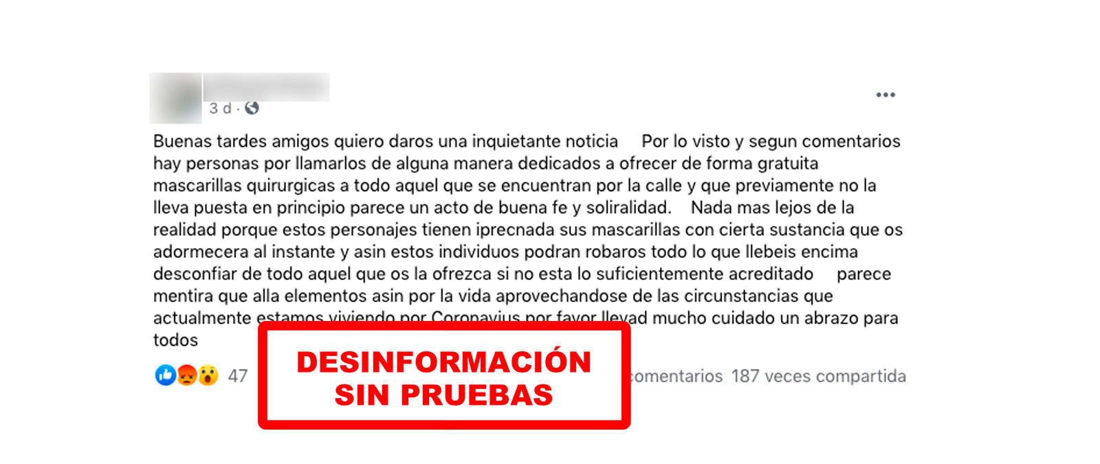 Está circulando en redes una cadena que asegura que hay delincuentes parando por la calle a quienes no llevan mascarilla para repartirles una que está “impregnada con cierta sustancia” con tal de robarles. Sin embargo, la Policía Nacional y la Guardia Civil no tienen constancia de ninguna denuncia por esta práctica en España a fecha de 20 de julio de 2020.