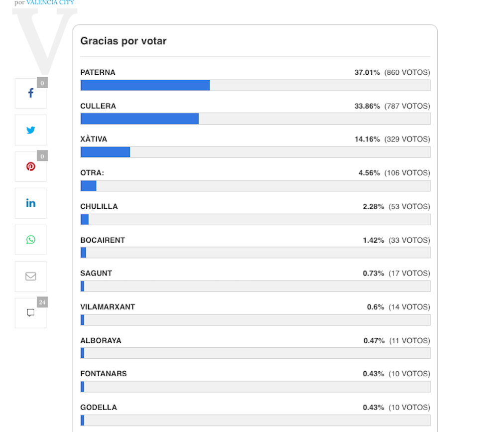 La localidad de l’Horta ha conseguido el 37% de los votos, mientras que Cullera es segunda con algo más del 33% y Xàtiva, tercera con un 14%. A partir de ahí se abre cierta distancia con el resto de localidades valencianas que encabeza Chulilla, con el 2%, Bocairent que suma un 1,4% y Sagunt, con un 0,73%.