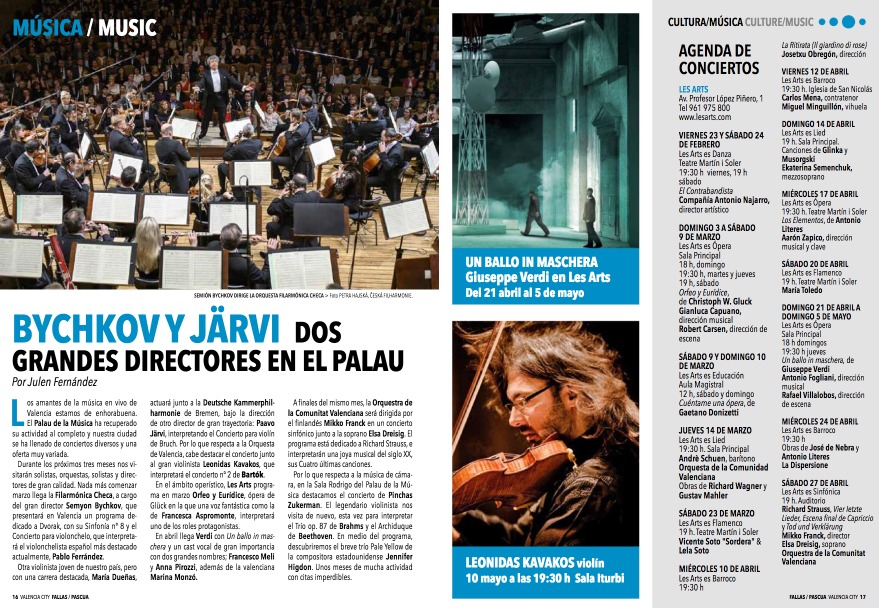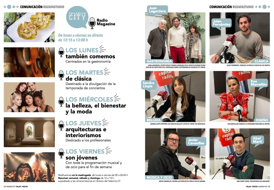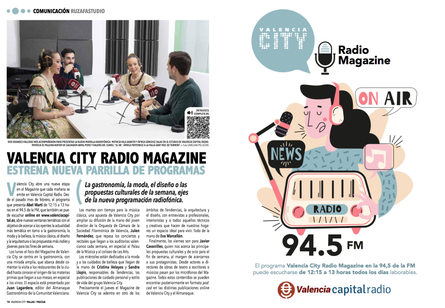 Pre­ci­sa­men­te la nue­va ofer­ta radio­fó­ni­ca de Valen­cia City es uno de los temas que abor­da la revis­ta, con la pre­sen­ta­ción tan­to de los nue­vos espa­cios como de sus pre­sen­ta­do­res. Coin­ci­de esta pre­sen­ta­ción con la entre­vis­ta que este mis­mo lunes 1 de mar­zo, coin­ci­dien­do con el lan­za­mien­to del nue­vo núme­ro han rea­li­za­do Abel Mar­tí y Ser­gio Gea Boix a las falle­ras Patri­cia Vila Saba­ter, Falle­ra Mayor de la Falla Pin­tor Sal­va­dor Abril-Peris i Vale­­ro-Doc­­tor Sum­si y Áfri­ca Sán­chez Salas, de la falla Sant Roc de Torrent. Ambas, ade­más son las pro­ta­go­nis­tas de nues­tra por­ta­da.