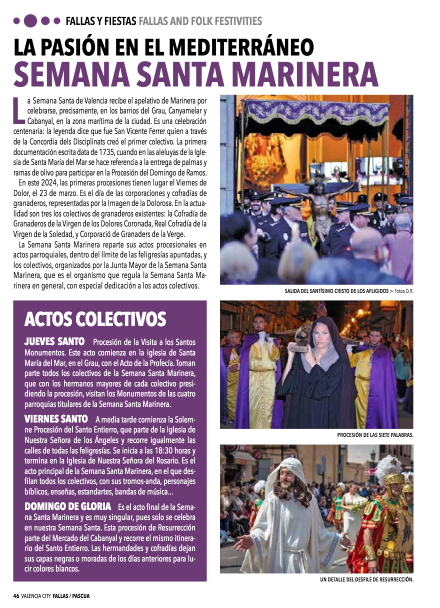 Ade­más, en el nue­vo núme­ro de Valen­cia City tam­bién se pue­de con­sul­tar la pro­gra­ma­ción de la Sema­na San­ta Mari­ne­ra, la otra gran cele­bra­ción de la ciu­dad en este pri­ma­ve­ra, que este año cae a fina­les de mar­zo.