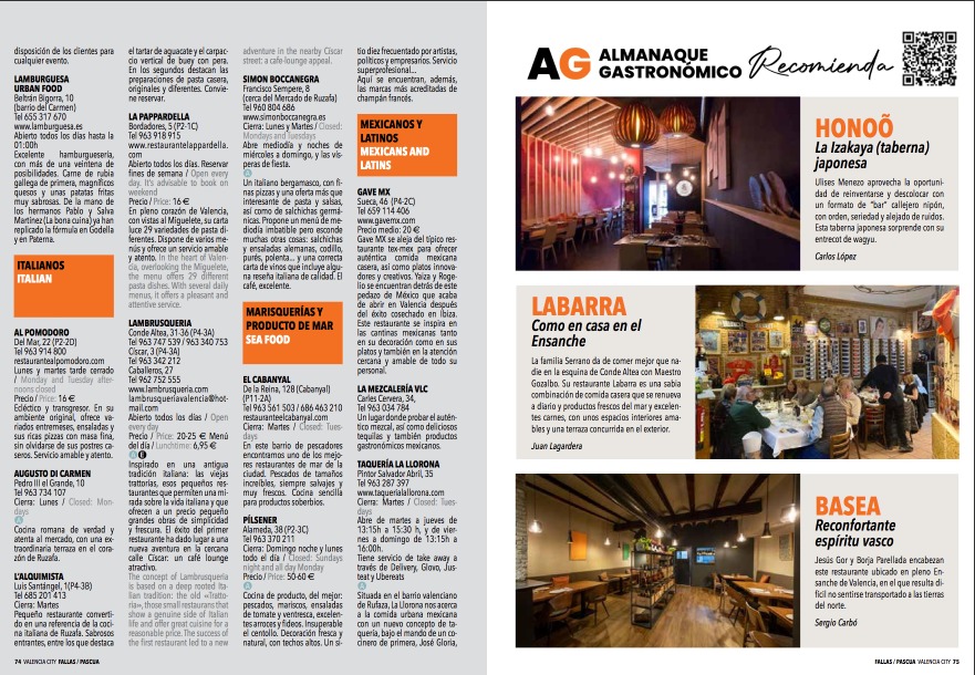 El mejor direc­to­rio de res­tau­ran­tes y pro­pues­tas gas­tro­nó­mi­cas de la ciu­dad tam­bién tie­ne su espa­cio en el nue­vo núme­ro de Valen­cia City, con reco­men­da­cio­nes que lle­gan de la mano de Alma­na­que Gas­tro­nó­mi­co, la publi­ca­ción her­ma­na de la guía.