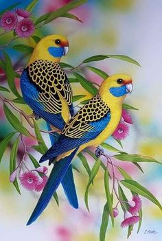 Cuadro sobre lienzo. Seis pájaros coloridos en una AST Naturaleza.