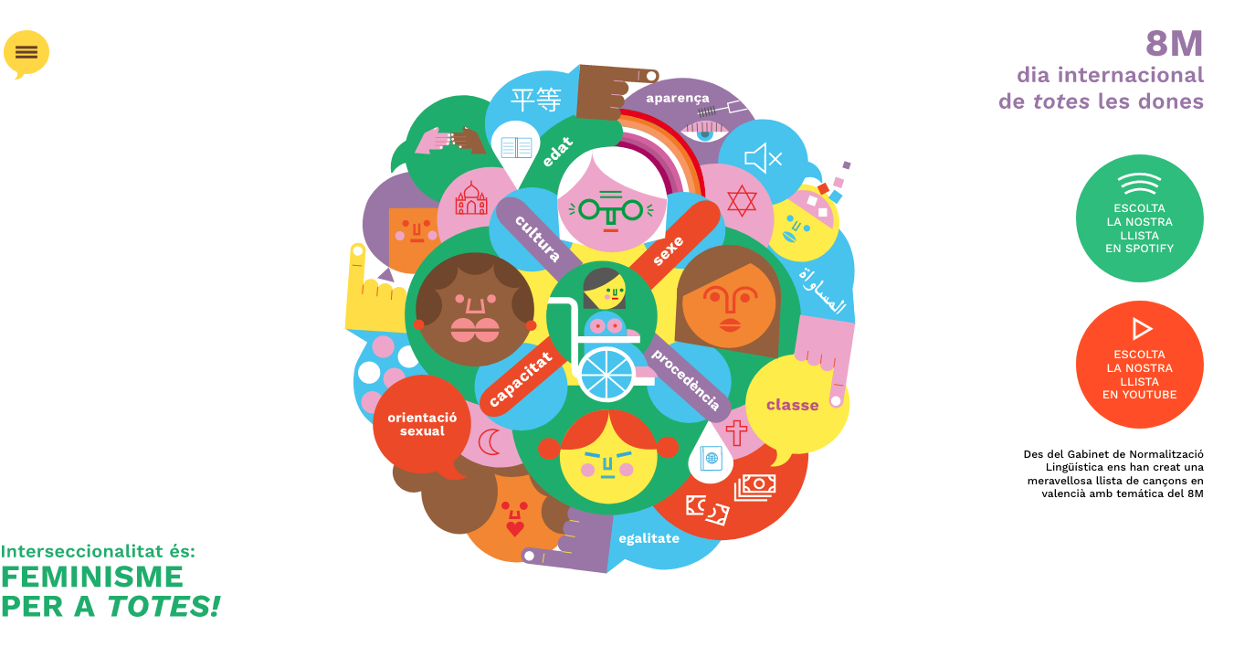 La campanya “Feminisme per a totes!” introduïx el termini “interseccional” “per tal de mostrar que cal canviar les estructures de la nostra societat des d’una perspectiva feminista que tinga en compte l’experiència vital i col·lectiva de totes i cadascuna de les dones, amb identitats coexistents, com per exemple (dona i pobra)”.
