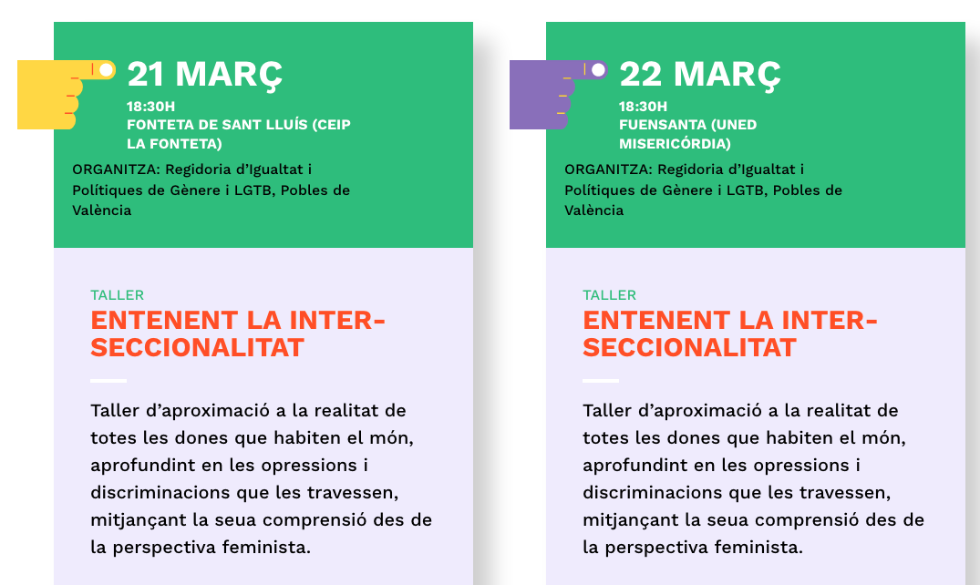 Els dies 21, 22 i 23 de març es desenvoluparan tres tallers descentralitzats a tres barris de la ciutat sobre conceptes bàsics de feminisme interseccional. Esta proposta s’adreça a persones adultes i joves que tinguen interés a apropar-se a la perspectiva afro feminista i antiracista de la realitat que viuen moltes dones travessades per estes identitats.
