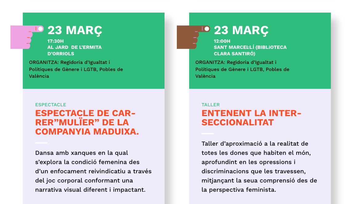 El cartell d’esta campanya “representa les diferents tipus de discriminacions i opressions”, i el programa d’actes, que es pot consultar a la web www.valencia.es/8m2022 inclou xarrades, espectacles, tallers i altres activitats “per tal de remoure des de diferents àmbits tots els destorbs que impedissen l’exercici igualitari de tota la ciutadania”.