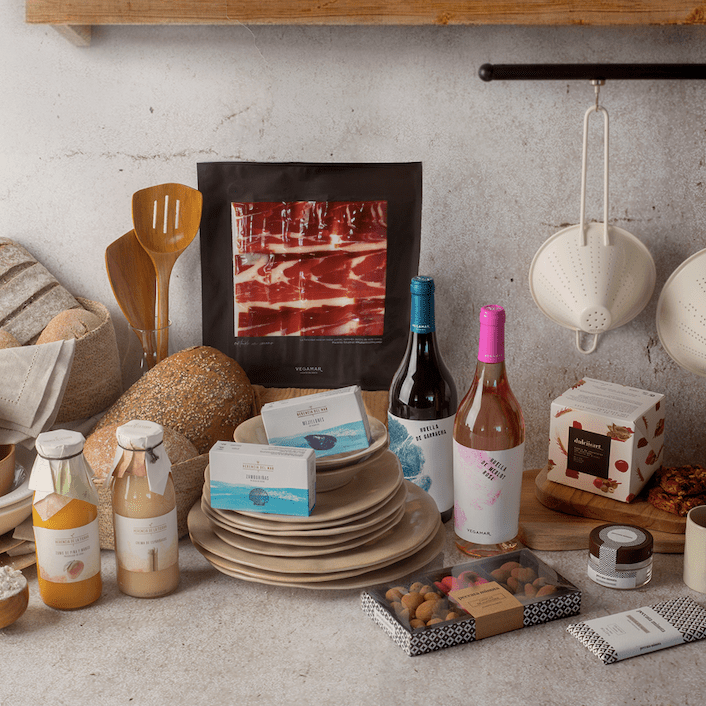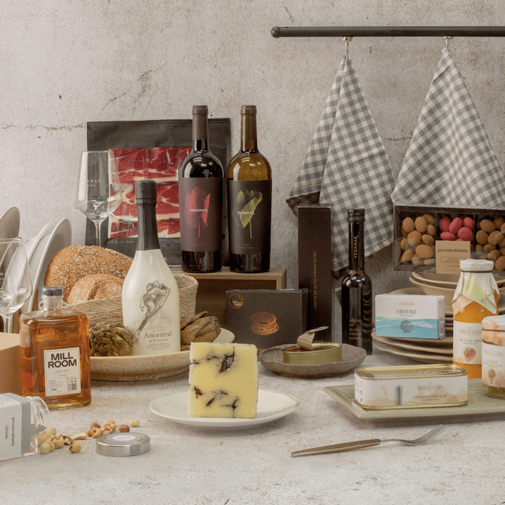 Los packs están crea­dos para todos los gus­tos. Con el Ances­tral blan­co Mer­se­gue­ra, con ver­mut Oh la lá!, vino blan­co Hue­lla de Mer­se­gue­ra, blan­co de Autor, tin­to Esen­cia Vega­mar Gar­na­cha Syrah, tin­to Autor y vino rosa­do Hue­lla de Mer­lot Rosé. Y para acom­pa­ñar, sus meji­llo­nes en esca­be­che y sus zam­bu­ri­ñas de las Rías Galle­gas Heren­cia del Mar, con ibé­ri­cos como el Jamón 100% ibé­ri­co de bello­ta, que­so tru­fa­do, y con­ser­vas Heren­cia del Mar, como las zam­bu­ri­ñas en sal­sa de viei­ra o los meji­llo­nes en esca­be­che de las rías galle­gas, y las de Heren­cia de la Tie­rra, como los cora­zo­nes de alca­cho­fa y los espá­rra­gos. Cre­mas de piña y man­go y de espá­rra­gos, su foie gras entier de pato Önd de Anas y su cock­tail de fru­tos secos pre­mium Pecat­ta Minu­ta.