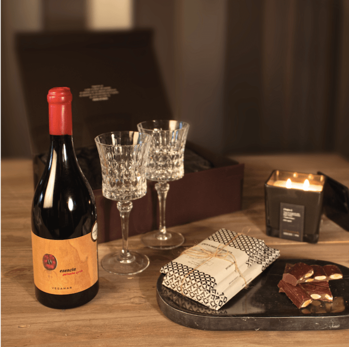 Y para los que pre­fie­ran vino su pro­pues­ta de Tin­to y cho­co­la­te a la luz de las velas con su tin­to Esen­cia Vega­mar Gar­na­cha Syrah y vino de Autor. Ambos packs acom­pa­ña­dos de sus cho­co­la­tes Pecat­ta Minu­ta y los bom­bo­nes los bom­bo­nes dul­ce de leche Lin­dor de Lindt.