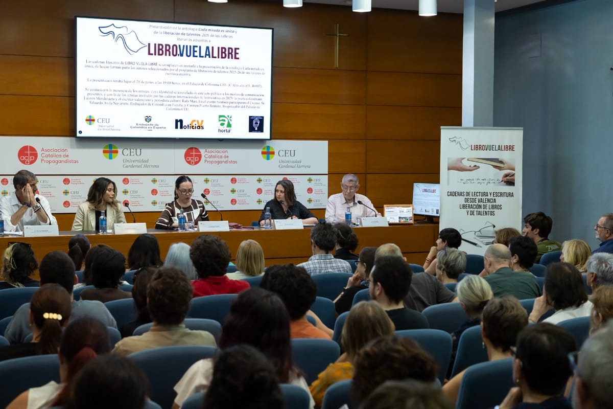 Fue una fiesta literaria, plena de vitalidad y cariño, organizada por los talleres literarios adscritos a la iniciativa «Libro, Vuela Libre», dirigidos en Valencia por Aurora Luna con alta creatividad y un trabajo serio. El Palacio de Colomina, sede en Valencia de la Universidad CEU Cardenal Herrera, acogió el pasado miércoles 25 de junio, un emotivo acto de hermanamiento literario de Valencia con Colombia. El acto, con el salón lleno, contó con la participación por videoconferencia de Eduardo Ávila Navarrete (embajador de Colombia en España) y con la presencia en la mesa presidencial de Jéssica Paola Negrete (cónsul adjunto del Consulado de Colombia en Valencia), de Carmen Puerto (coordinadora responsable del Palacio de Colomina CEU), de la citada Aurora Luna y de los periodistas culturales Jimmy Entraigües y el arriba firmante (un honor para mí haber sido invitado a pronunciar unas palabras en este acto de hermanamiento cultural).