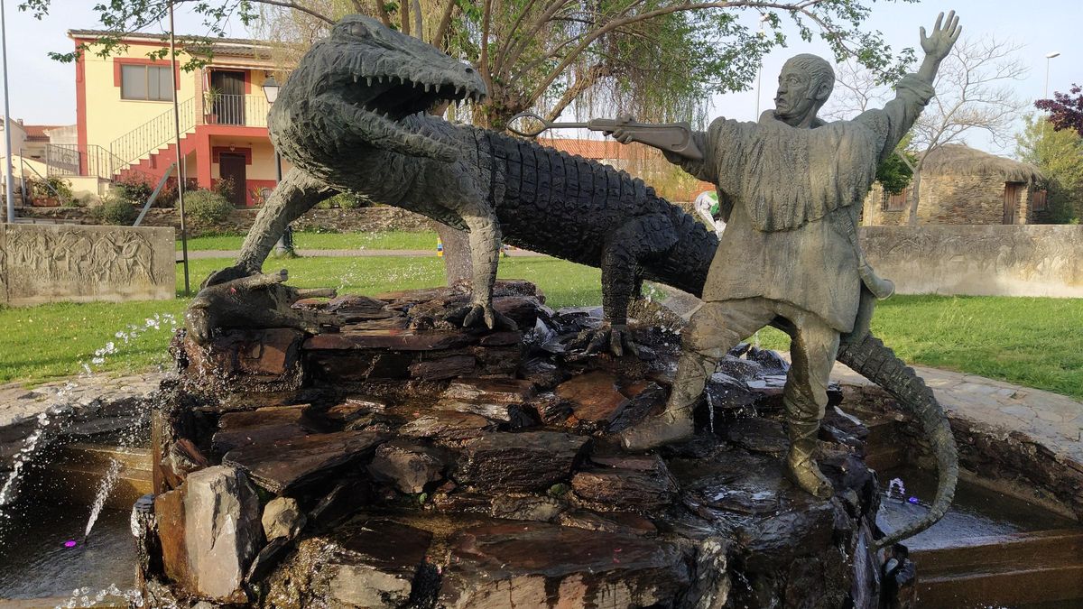 Foto­gra­fía supe­rior: escul­tu­ra dedi­ca­da a la leyen­da del lagar­to de Cal­za­di­lla (Extre­ma­du­ra)