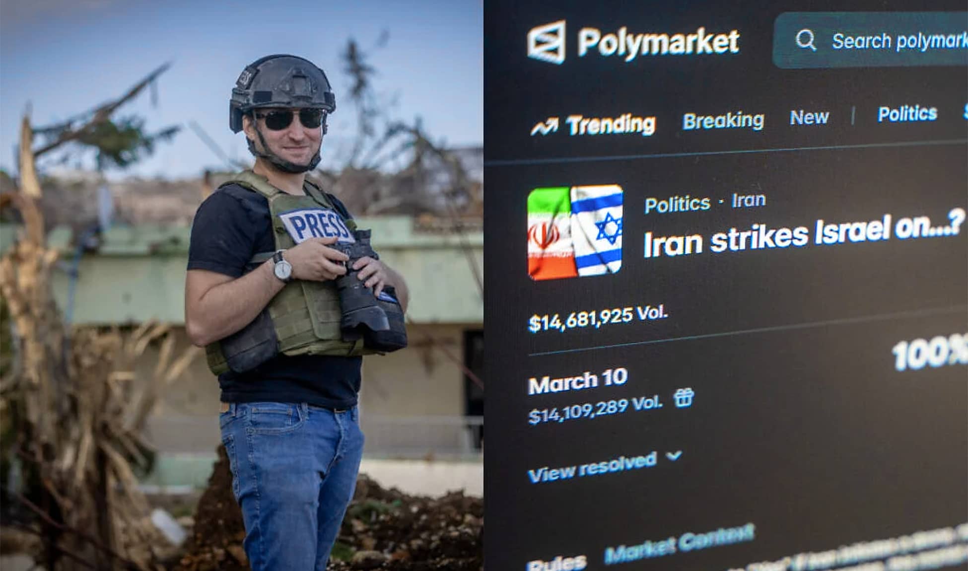 Izquierda: Emanuel Fabian, corresponsal militar de The Times of Israel, en el sur del Líbano el 21 de noviembre de 2024; Derecha: foto, tomada el 16 de marzo de 2026, muestra una apuesta en el sitio web de Polymarket titulada “¿Irán ataca a Israel el…?” (Chaim Goldberg/ Flash90; Emanuel Fabian/ Times of Israel).